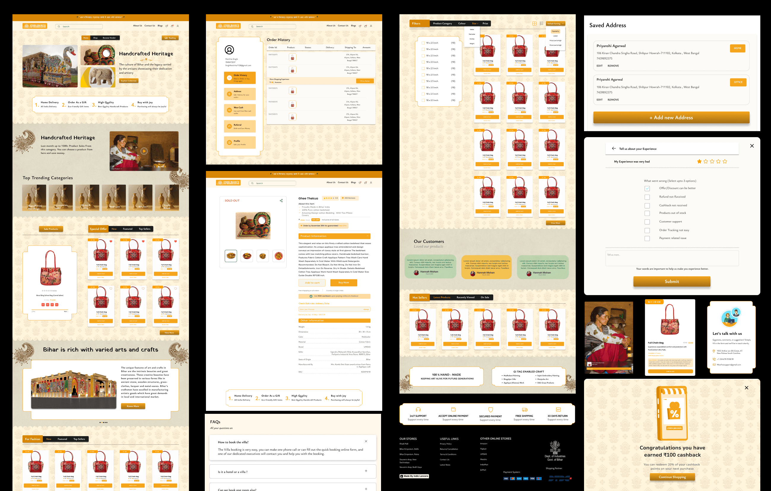 Design Overview: The new design employs a clean, grid-based layout for product discovery, a well-organized top navigation bar, and prominent calls to action throughout. A dedicated “Become a Vendor” page simplifies artisan onboarding, while the user dashboard includes order history, address management, and a wallet (Woo Cash). A warm color palette and traditional motifs pay homage to India’s handicraft heritage, creating a visually cohesive experience that aligns with government branding requirements.